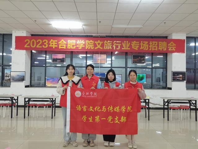 2023年3月16日星期四下午,语言文化与传媒学院学生第一党支部的学生党员们来到了图书馆招聘厅,为2023年合肥学院文旅行业专场招聘会进行志愿服务活动。