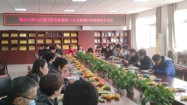 11月14日下午,语言文化与传媒学院在二楼会议室召开全体教职工大会暨期中师德师风学习会,会议由院长丁增武主持。