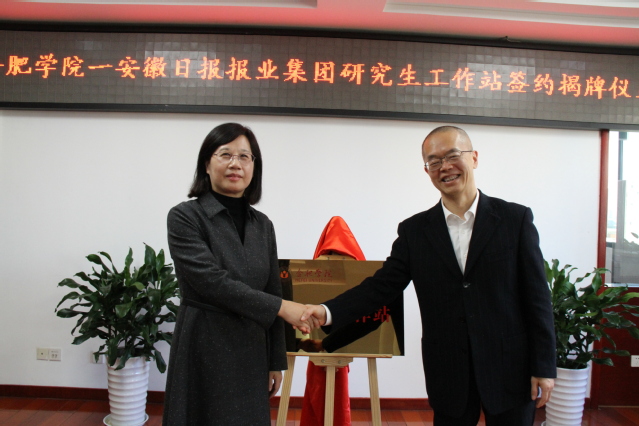 党委研究生工作部部长、研究生处处长葛春梅与安徽日报报业集团人事处处长张擎分别代表合作双方签署共建研究生工作站框架协议,吴春梅与范荣晖共同为研究生工作站揭牌。