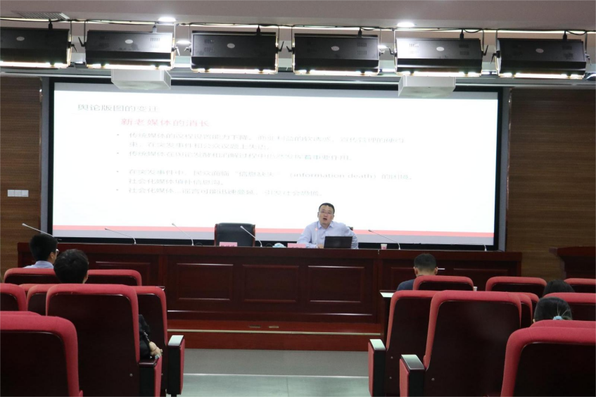 5月27日上午九点三十分,由语言文化与传媒学院主办的“善思讲坛”中青年学术讲座在一期六号楼报告厅顺利举行。本次讲座邀请了人民网安徽舆情监测研究中心主任李家林作题为“新闻的B面:技术赋权下的舆论场嬗变、媒体使命与舆论引导”的学术报告。讲座由语言文化与传媒学院副院长殷明明教授主持,学院80余位师生参加讲座。