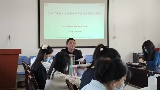 党的二十大报告强调,坚定不移全面从严治党,深入推进新时代党的建设新的伟大工程。为落实党委全面从严治党主体责任,推动全面从严治党向纵深发展,外国语学院全体学生党员于10月16日在一期八栋三楼会议室参加廉政党课学习,党委副书记吴孔宝担任主讲人。