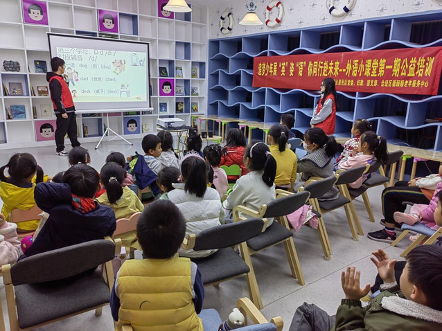为了丰富社区儿童的课余生活,培养他们外语学习的兴趣,2023年4月8日下午,外国语学院团委组织志愿者来到海恒社区海书阁城市阅读空间,开展外语小课堂第一期公益培训。此次公益小课堂的举行,吸引了不少家长与适龄儿童前来参加。