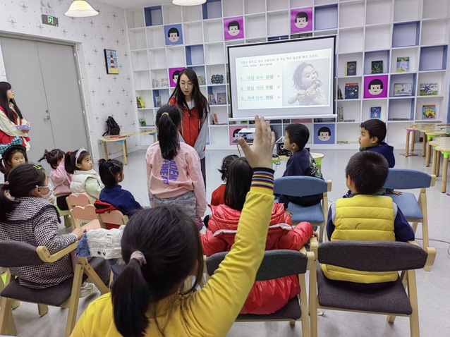 随后,志愿者们介绍了韩国的饮食,把韩语基本单词的发音融入韩国生活场景中,整个课堂集生动性、知识性、趣味性为一体。同时,他们播放了介绍韩国饮食的视频,提高了小朋友们对韩国饮食文化的理解程度。提问环节,小朋友们踊跃举手回答,课堂学习气氛浓烈。