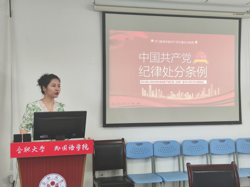 根据学院党纪学习教育计划安排,6月12日,外国语学院学生第一党支部书记李菲菲,以“学习解读中国共产党纪律处分条例”为主题,支部全体党员上了一次专题党课