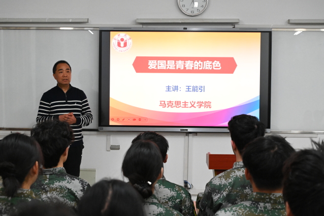 2月27日,我校在35栋204教室举办了一场题为“青春的底色是爱国”的专题讲座。马克思主义学院王能引副教授主讲,校学工部人武部副部长陶龙泽、2025年春季应征毕业生、校国旗护卫队全体队员参加讲座。