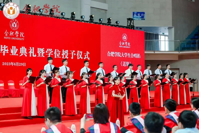 典礼开始前,全场齐唱《没有共产党就没有新中国》,校大学生合唱团演唱《送别》《西风的话》,随后会场播放合肥学院宣传片、合肥学院祝福视频、2023 届毕业生毕业视频。