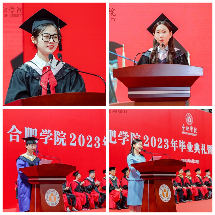 本科生毕业生代表郭盼、研究生毕业生代表刘王伟、留学生代表李侑琎、教师代表徐天戍先后发言。郭盼深情回顾了四年的合院时光,向老师们的悉心栽培致以衷心感谢。刘王伟讲述了自己的科研经历,号召大家敢于创新、勇于担当,为社会发展多做贡献。李侑琎回忆了来华求学的心路变化和收获体会,祝愿母校蒸蒸日上、再创辉煌。徐天戍寄语毕业生时时不忘身为中国青年的责任,坚守初心如磐,不驰于空想、不骛于虚声,共同为实现第二个百年奋斗目标献出属于青年的力量。