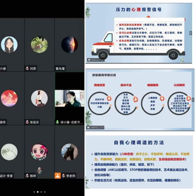 为进一步加强家校联动和心理健康工作队伍建设,7月4日晚,学生处邀请了合肥市精神卫生防治中心徐小童副主任,面向学生家长和学工队伍举办了以《心理健康促进与情绪自我调试》为主题的线上讲座。我校学工队伍、部分学生家长和学生骨干参加了此次讲座,讲座由学生处心理健康教育科谢琛主持。