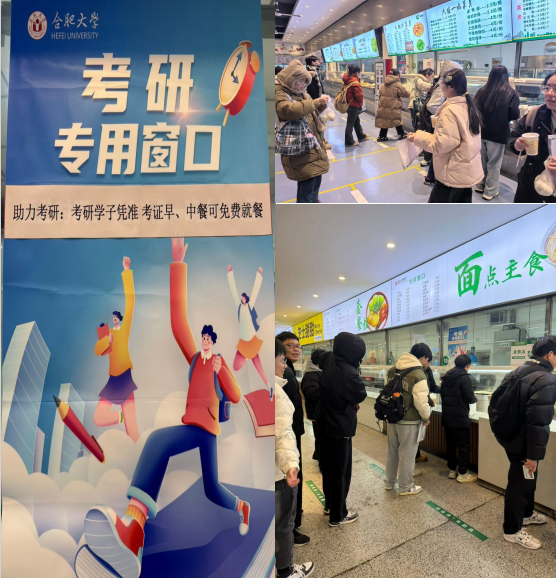 学校全力为考生提供暖心后勤保障服务,食堂开设考研专用窗口,考试期间免费供应一日三餐及暖心姜汤,提供营养均衡、种类丰富的菜品,赠送“考研助力包”,为考研学子加油鼓劲。