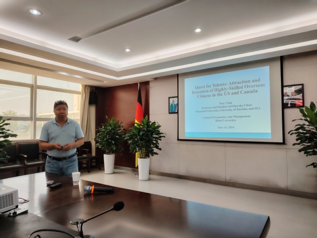 方涛教授以“Attraction and retention of highly skilled overseas Chinese in the United States and Canada”为题给经济与管理学院师生做一场精彩的学术报告,他结合丰富的研究数据与案例,深入剖析美加两国吸引和留住海外华人高技能人才的策略。报告结束后,方涛与经济与管理学院师生、德籍教授汤卫思进行座谈,就国际人才流动趋势、区域经济发展与人才政策等议题展开讨论,碰撞出诸多思想火花。