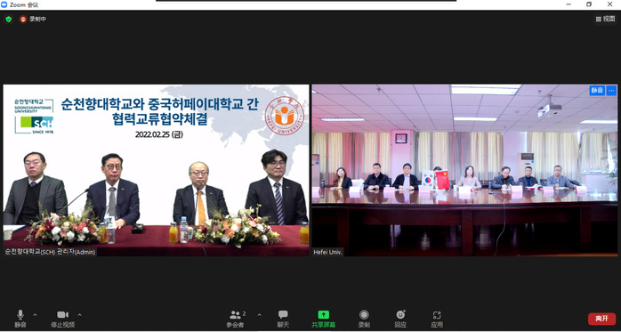 为深入推进对韩教育合作,引进国外优质教育资源,提升应用型人才培养水平,2月25日,我校与韩国顺天乡大学举行视频会议,商谈深入合作内容并签订友好合作协议。合肥学院校长吴春梅,顺天乡大学校长金承禹、副校长全仓完出席。两校相关院系、部门负责人和专业教师参加视频会议。