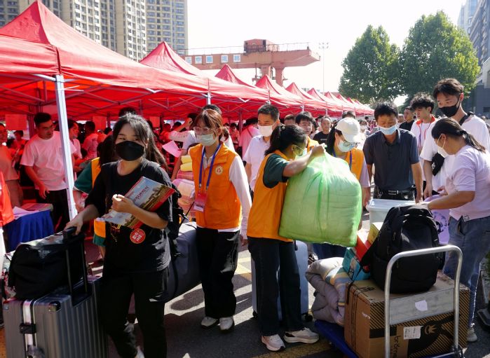 各二级学院、相关职能部门的工作人员和学生志愿者们早早赶到校内外迎新点,为新生提供细致入微的“一站式”进校服务。校园里红幅高悬、彩旗飘飘,各类迎新标语鲜亮醒目,温馨热闹;工作人员和志愿者在校园各门口、测温处、迎新车辆接待处、各学院报到处等服务站点为新生耐心讲解、细致引导。学校在高铁站、汽车站等地设立迎新站点,不间断发送班车迎接新生。